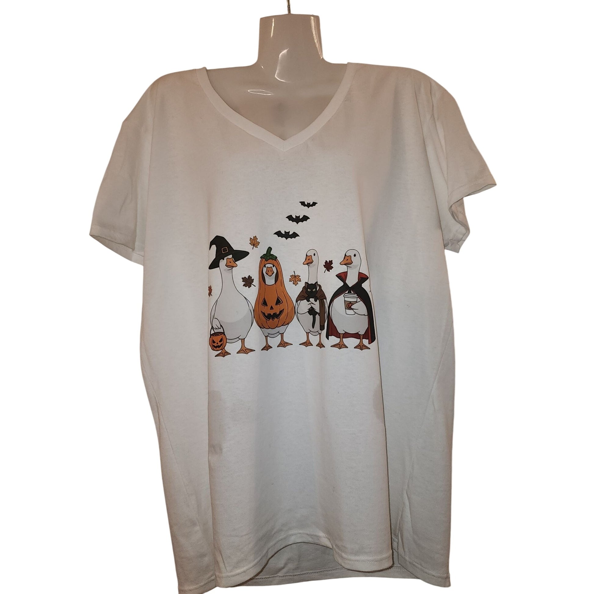 Halloween Goose-Themed XL White V-Neck T-Shirt Heavy Cotton Gildan Fall Design