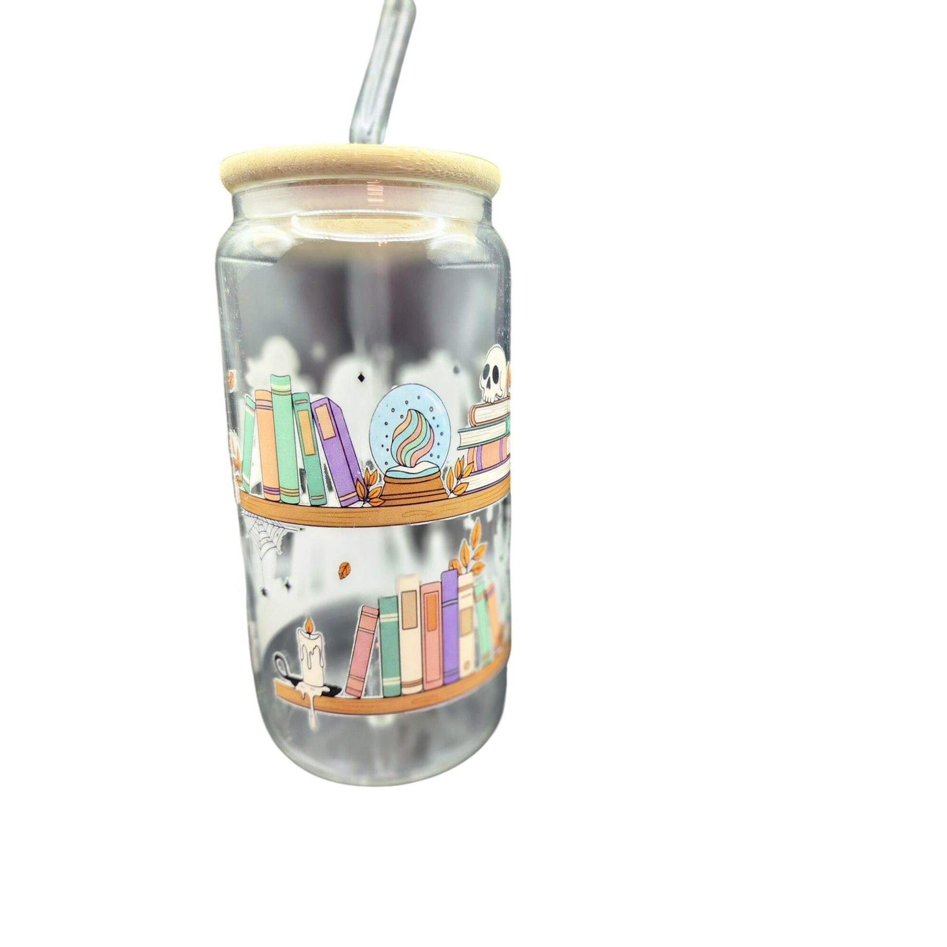 Halloween-Themed Glass Tumbler Cup With Bamboo Lid & Straw - Witchy Bookshelf Design