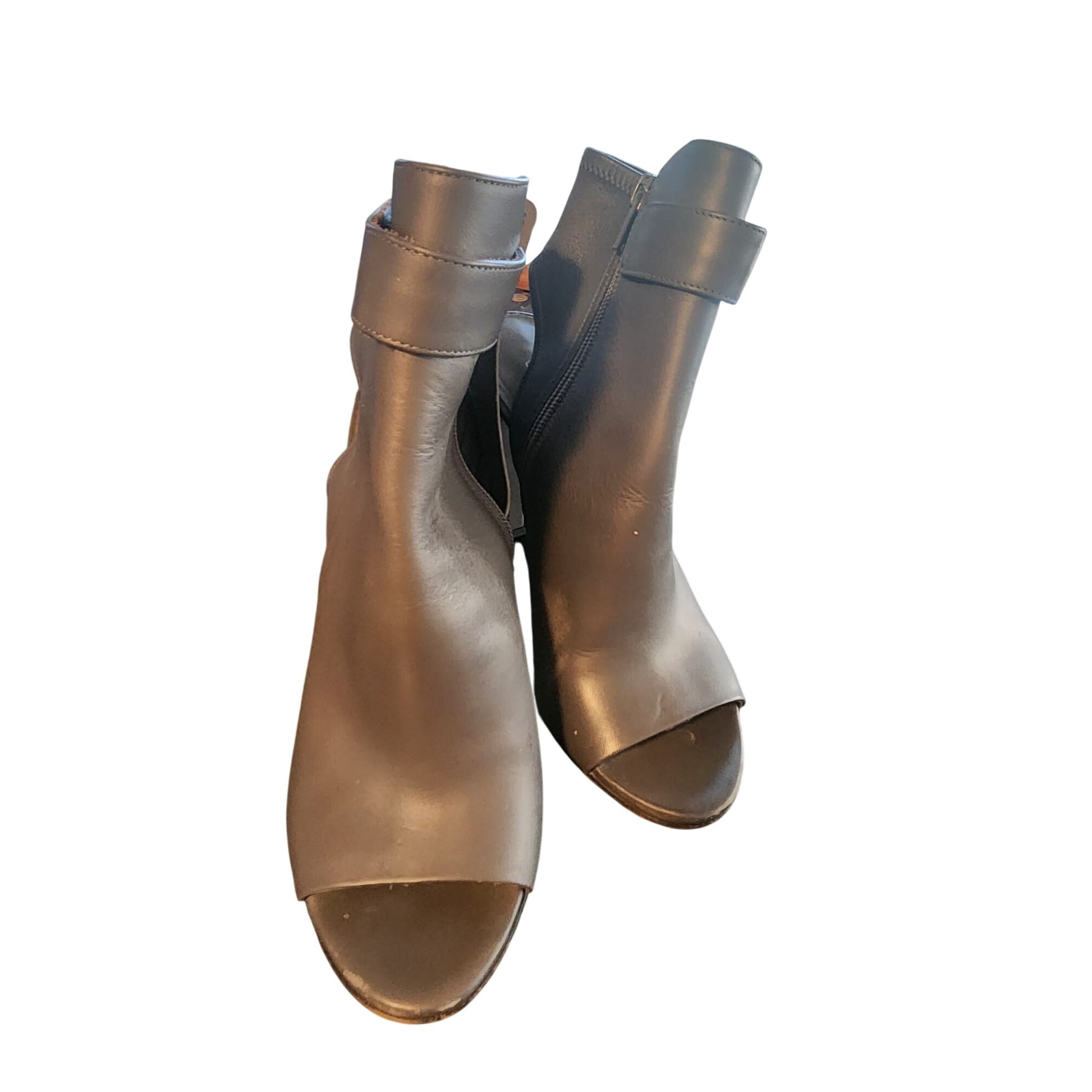 These designer Vince Brigham Peep Toe ankle booties feature a sleek open heel design and a sophisticated gray leather finish, perfect for adding elegance to any wardrobe.